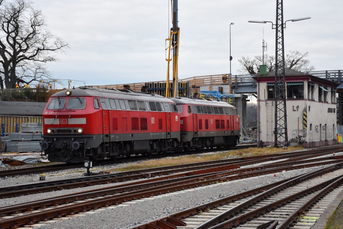 218 105 der Nesa überführte am 27.01.18 eine Speno-Schleifeinheit und weitere Bauzugwagen nach Muldenstein. Hier passiert der Zug den Bahnhof Gräfenhainichen.