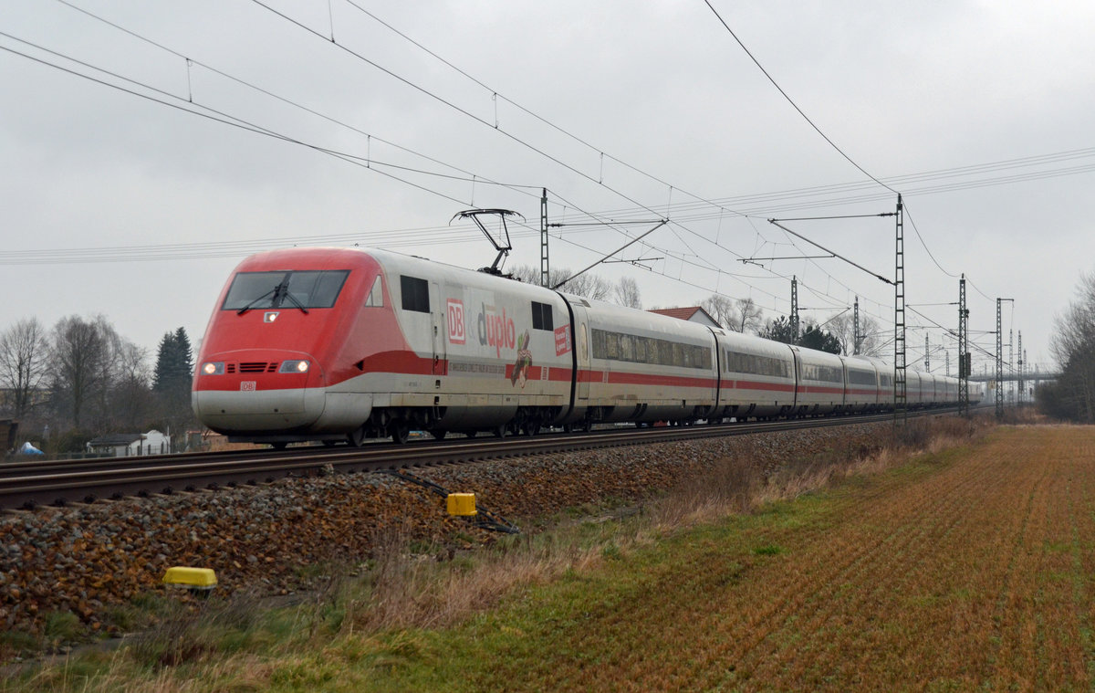 Der Duplo-ICE verkehrte am 27.01.18 als ICE 599 von Hamburg nach München. Hier durcheilt der Zug Gräfenhainichen Richtung Bitterfeld.