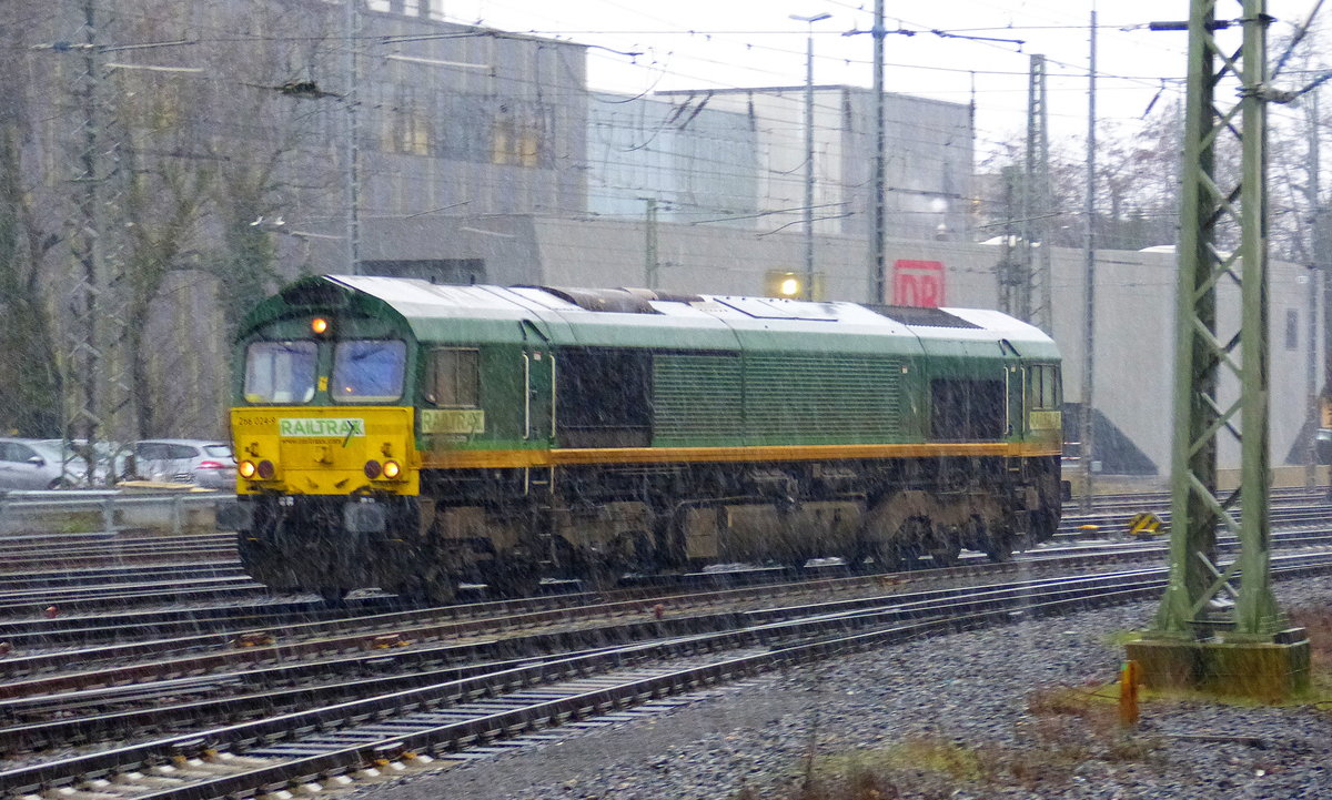 Ein Nachschuss von der Class 66 266 024-9 von Railtraxx und kommt als Lokzug aus Köln nach Aachen-West und fuhr in Aachen-West ein. Aufgenommen vom Bahnsteig in Aachen-West. Bei Schneefall am Nasskalten Nachmittag vom 2.2.2018.