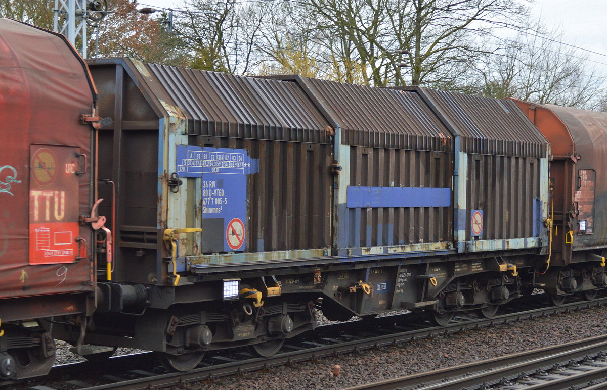 Drehgestell-Flachwagen mit Teleskophauben für Coiltransporte vom Einsteller VTG in Hamburg mit der Nr. 34 RIV 80 D-VTGD 477 7 005-5 Shimmns2 am 31.01.18 Berlin-Hirschgarten.