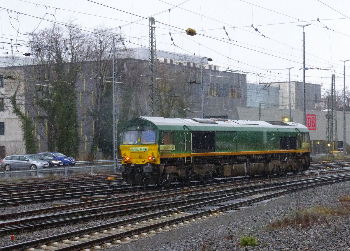 Die Class 66 PB18 von der Rurtalbahn-Cargo kommt als Lokzug aus  Stolberg-Rheinland nach Aachen-West und fährt in Aachen-West ein im Schneeregen am Nasskalten 2.2.2018.