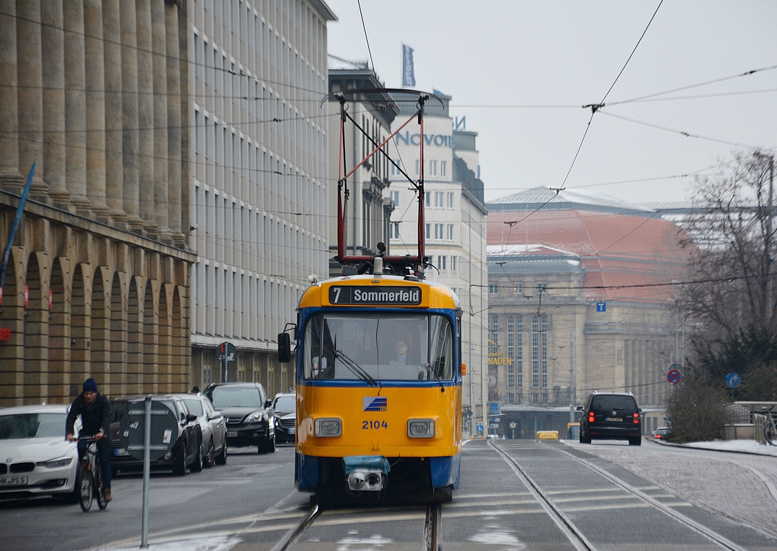 Eine Tatra Straßenbahn auf der Linie 7 nach Sommerfeld zwischen Haltestellen Hauptbahnhof und Augustusplatz. Leipzig, Goethestraße, 20.01.2016.