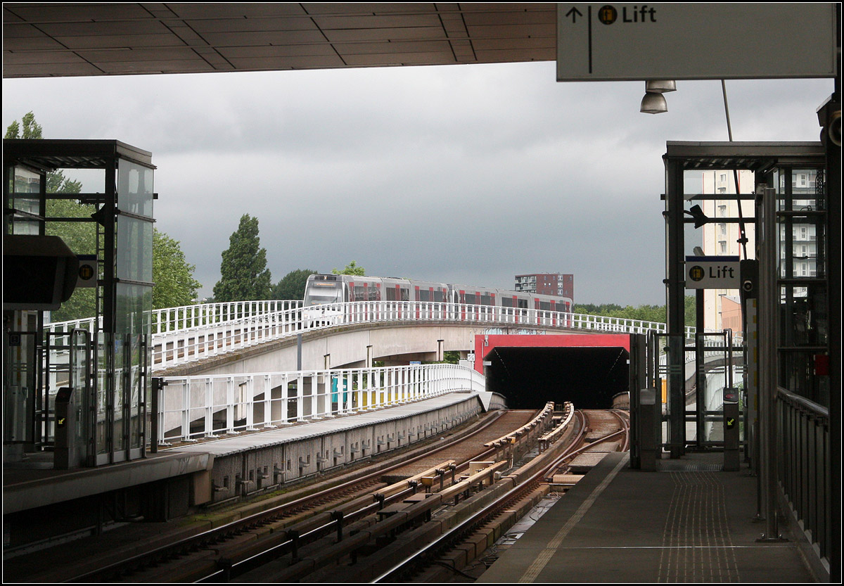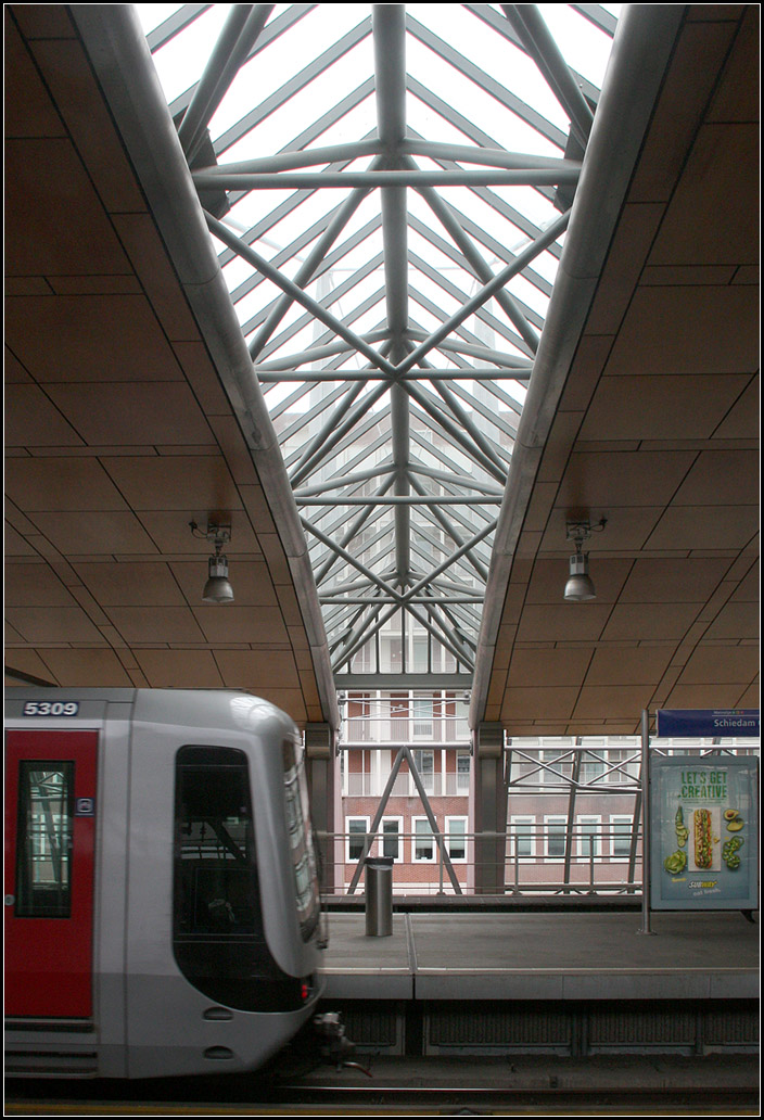 Schiedam Zentrum - Die geschlossenen Dachflächen dieser Rotterdamer Metrostation sind immer wieder durch Oberlichtstreifen unterbrochen. 21-06.2016 (M)
