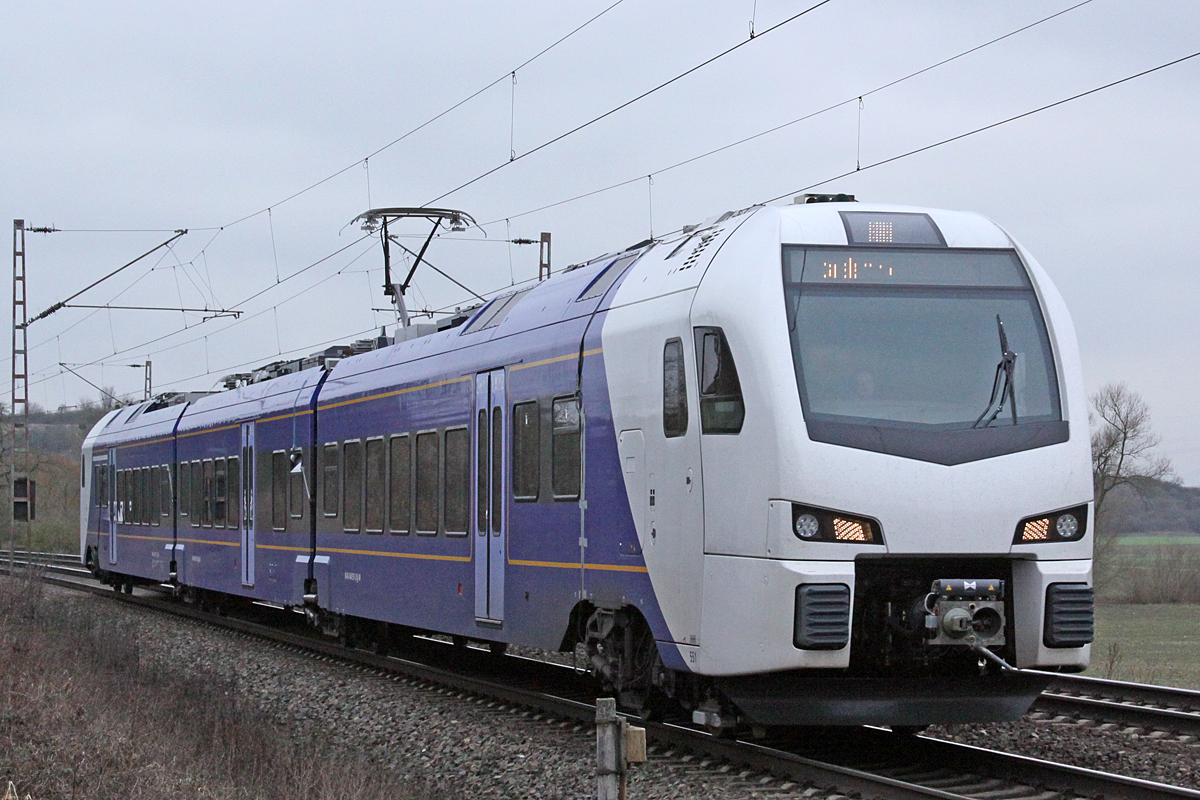 Stadler Flirt 160 3-teilig am 26.01.2018 13:16 nördlich von Salzderhelden am BÜ 75,1 in Richtung Kreiensen ( vermutlich auf Messfahrt denn von Drehgestell aus ist ein Kabel bis zum Fenster geklebt)
