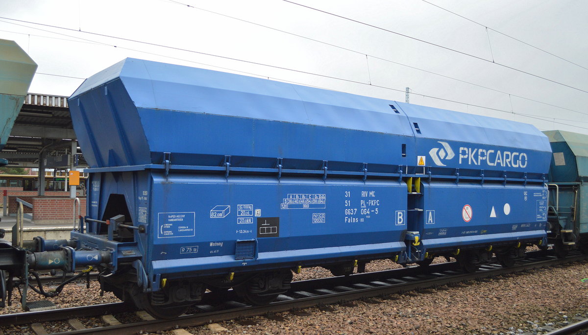 Vierachsiger Schüttgutwagen mit schlagartiger Schwerkraftentladung der polnischen PKP Cargo mit der Nr. 31 RIV MC 51 PL-PKPC 6637 064-5 Falns-xx 440V am 03.02.18 Bf. Flughafen Berlin-Schönefeld.