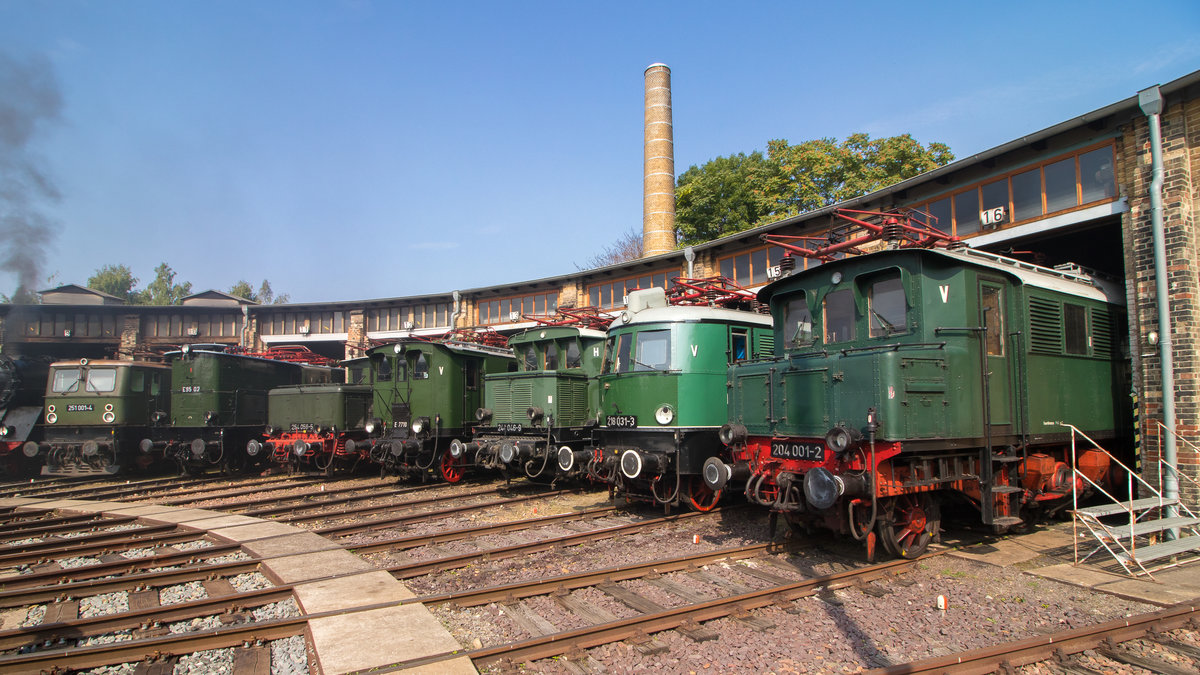 Zum DB-Fest in Halle waren viele Altbau-E-Loks zugegen. Wir schreiben den 27. August 2017, das Wetter war schön, die alten Damen in grün auch!