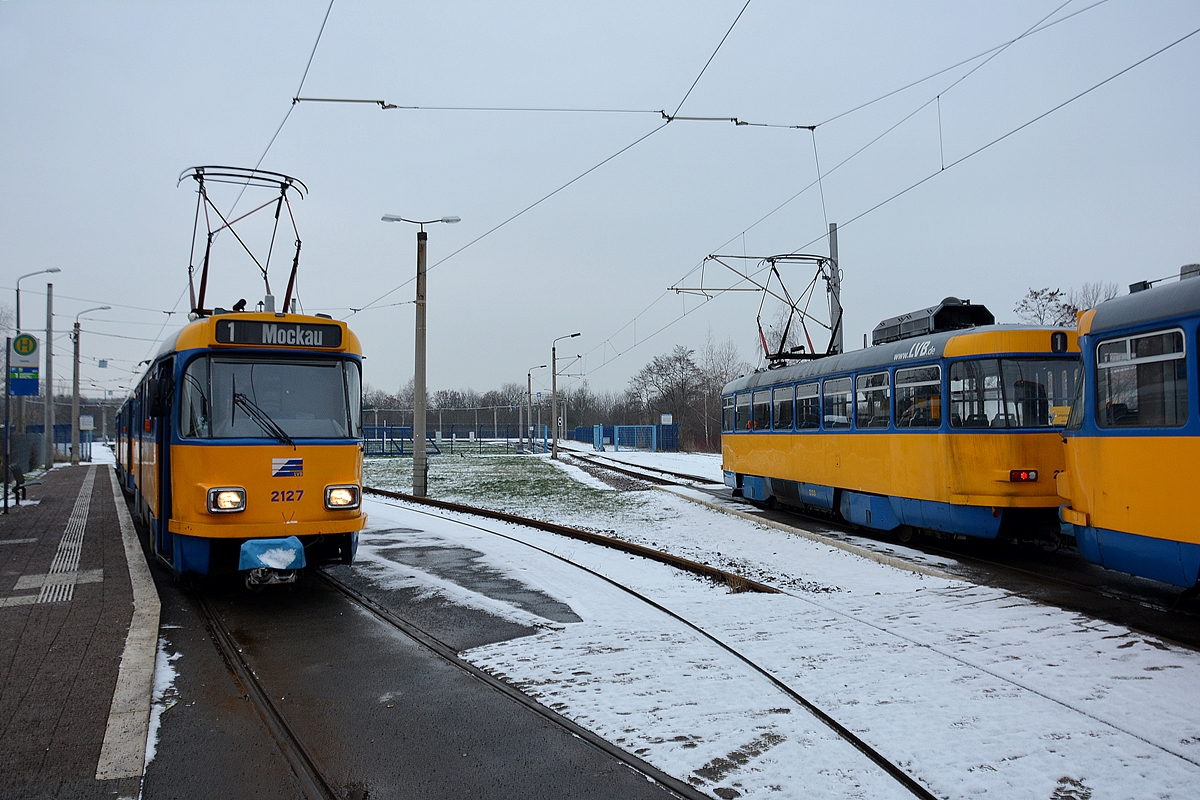 Zwei leipziger Tatra Straßenbahnen in der Schleife Lausen (Linie 1). Die Aufnahme stammt vom 20.01.2016.