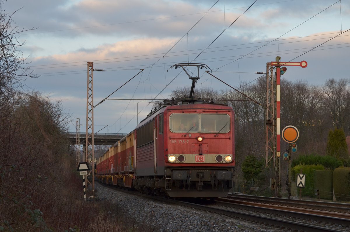155 178 mit einem langen weißen Latz zieht ein paar Güterwagen durch Ratingen. (13.01.18)