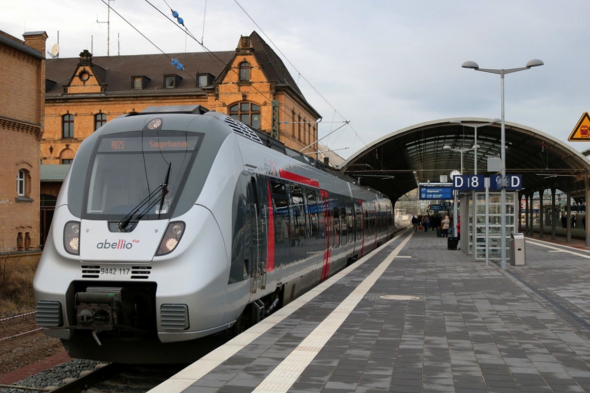 9442 117 (Bombardier Talent 2) von Abellio Rail Mitteldeutschland als RB 74780 (RB75) nach Sangerhausen verlässt ihren Startbahnhof Halle(Saale)Hbf auf Gleis 8. [27.12.2017 | 14:35 Uhr]