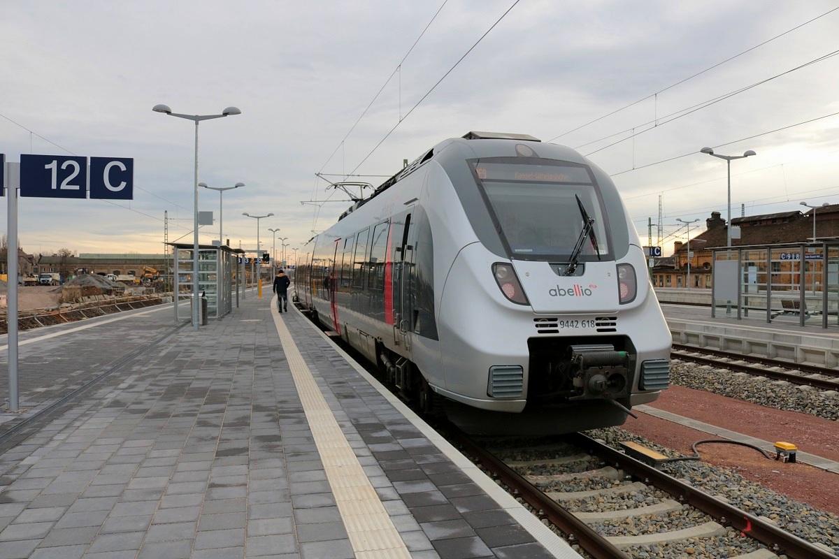 9442 618 (Bombardier Talent 2) von Abellio Rail Mitteldeutschland als RE 74712 (RE9) nach Kassel-Wilhelmshöhe steht in seinem Startbahnhof Halle(Saale)Hbf auf Gleis 12 A-D. [27.12.2017 | 14:27 Uhr]