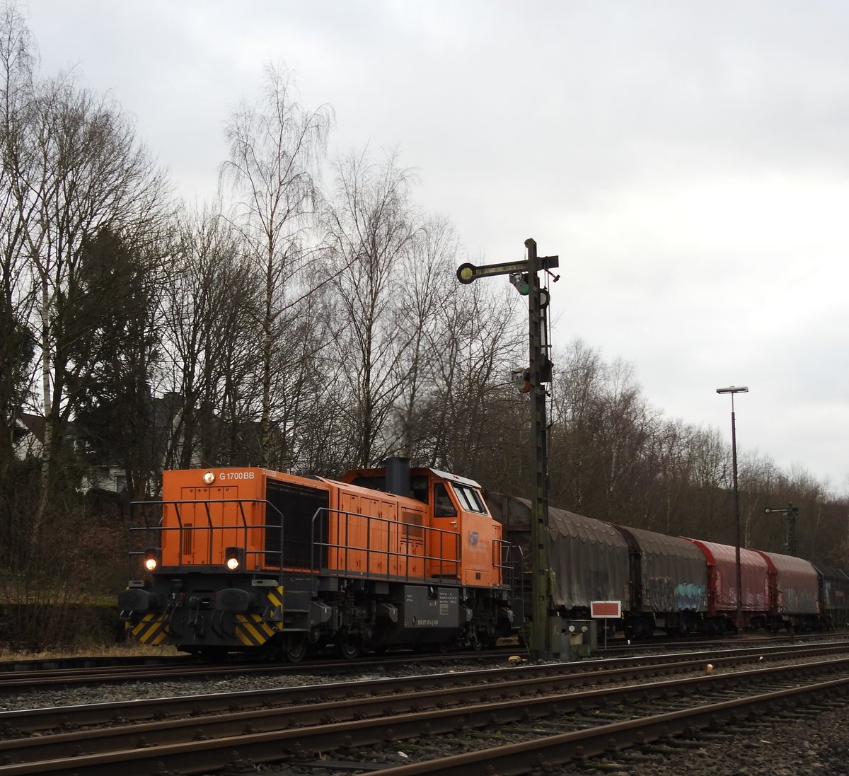 BAHNHOF HERDORF/HELLERTAL/HELLERTALBAHN MIT G 1700-DIESELLOK Diesellok G 1700 BB der KREISBAHN SIEGEN-WITTGENSTEIN mit Güterzug hat am 23.1.2018 unter dem alten Flügelsignal auf dem Nebengleis den Triebwagen der HELLERTALBAHN in Fahrtrichtung BETZDORF/SIEG passieren lassen und biegt gleich aufs Hauptgleis nach NEUNKIRCHEN/SIEGERLAND ein....