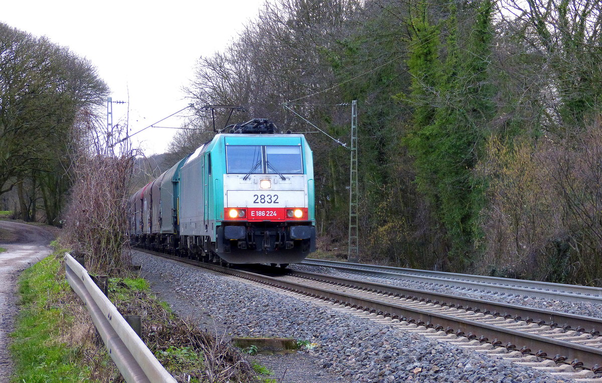 Die Cobra 2832 kommt die Gemmenicher-Rampe herunter nach Aachen-West mit einem Güterzug aus Kinkempois(B) nach Köln-Gremberg(D). Aufgenommen an der Montzenroute am Gemmenicher-Weg. Am Nachmittag vom 23.1.2018.