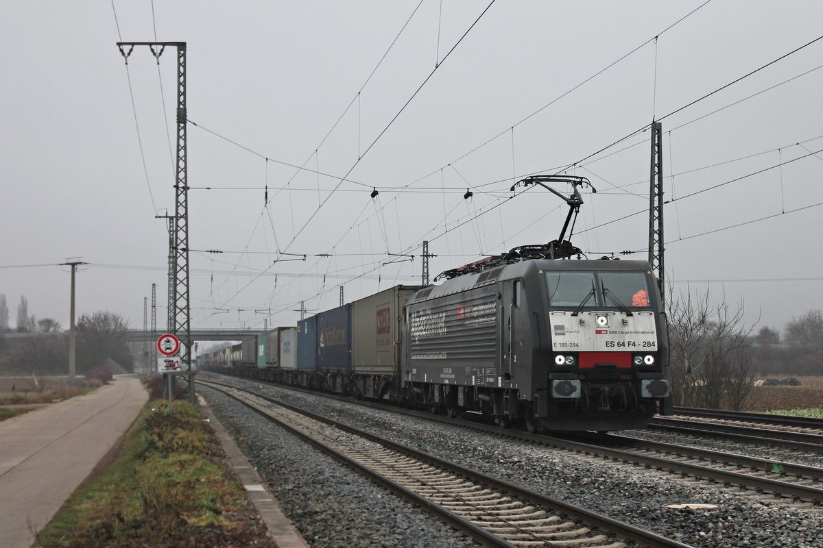 Durchfahrt am 20.12.2016 von MRCE/SBBCI ES 64 F4-284 (189 284-3) "Alpäzähmer" mit einem Containerzug aus Rotterdam Waalhaven durch Müllheim (Baden) in Richtung Schweizer Grenze.
