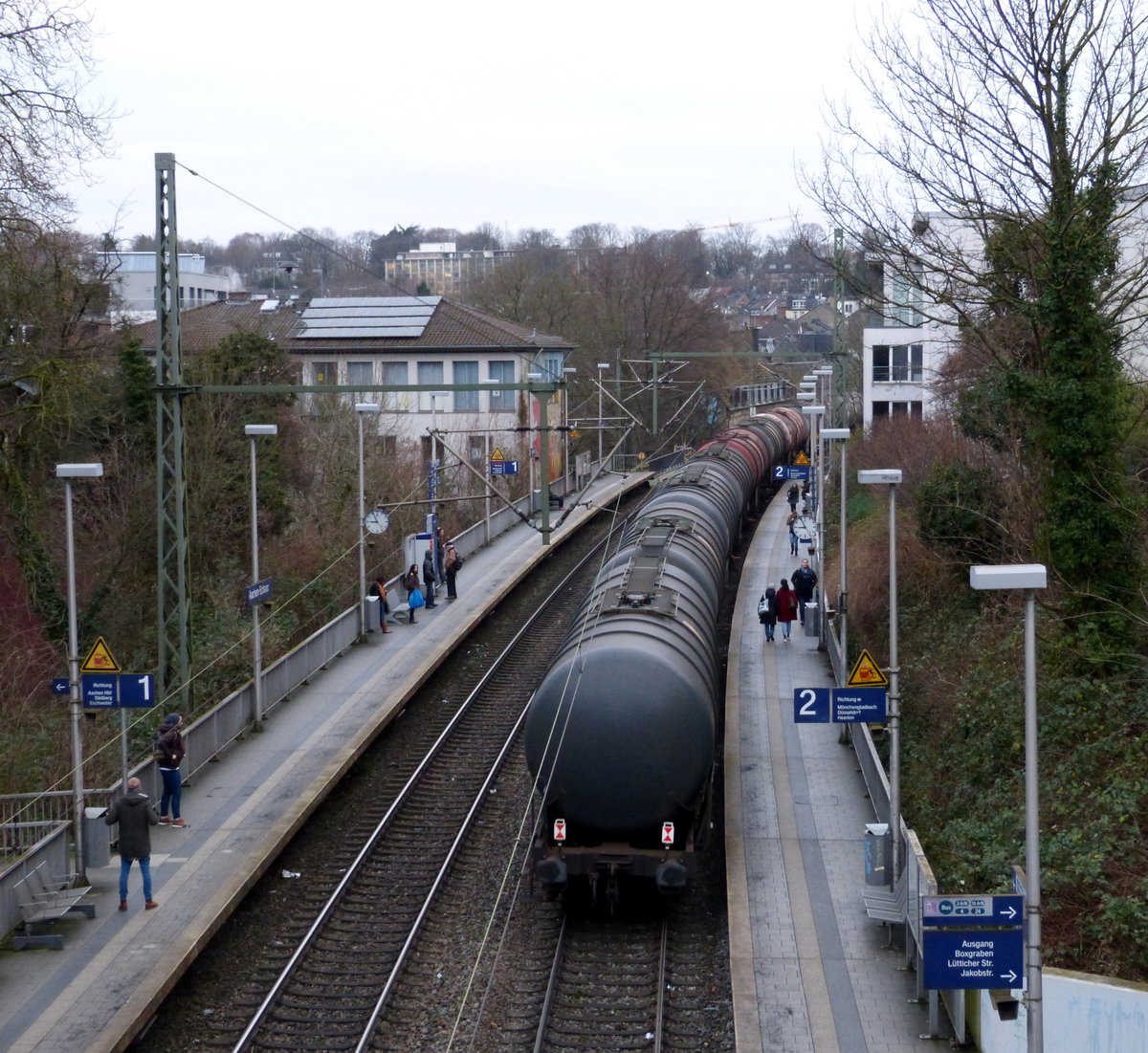 Ein Blick auf einen Ölleerzug aus Basel(CH) nach Antwerpen-Petrol(B). Aufgenommen von der Brücke in Aachen-Schanz. Am Morgen vom 23.1.2018.