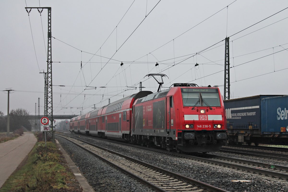 Einfahrt am 20.12.2016 von 146 236-5 "Schwarzwaldbahn Erlebnispfard/Triberg" mit ihrem RE (Offenburg - Basel Bad Bf) in den Bahnhof von Müllheim (Baden) in Richtung Schweizer Grenze.