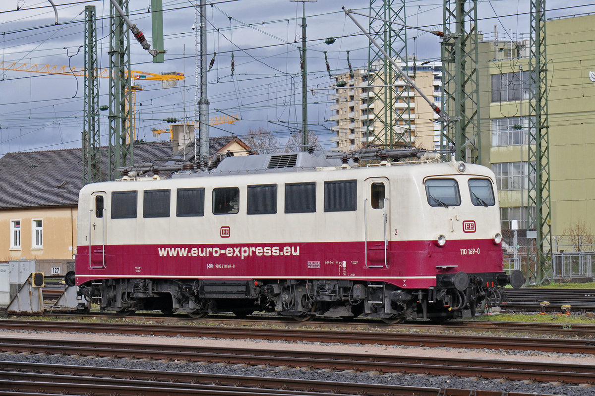 Euro-Express Lok 110 169-0 wartet am Badischen Bahnhof auf die nächste Fahrt. Die Aufnahme stammt vom 19.01.2018.