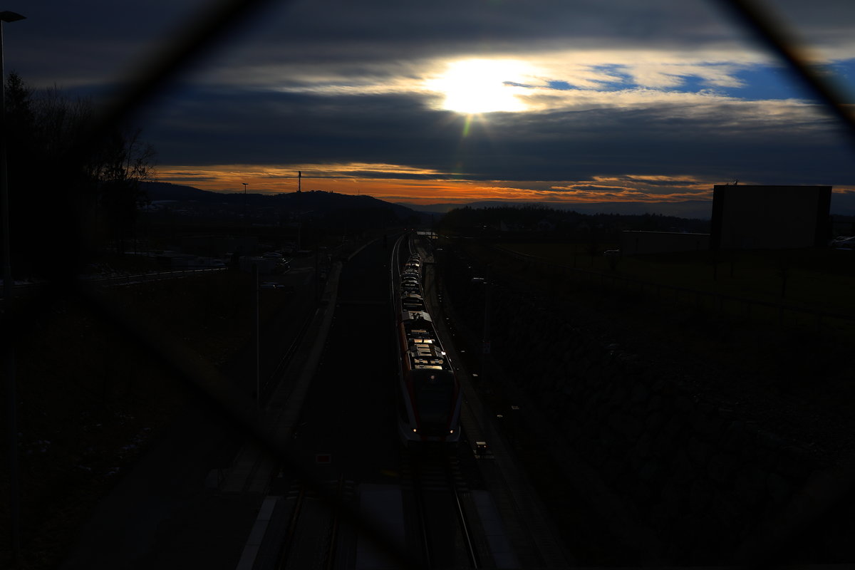 Mit den letzten Sonnenstrahlen verlässt dieses Pärchen GTW2/8 den Bahnhof Hengsberg und verschwindet unter meinen Füßen im Hengsbergtunnel. 22.01.2018