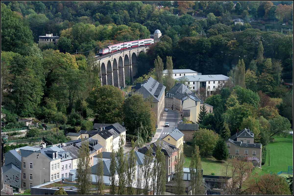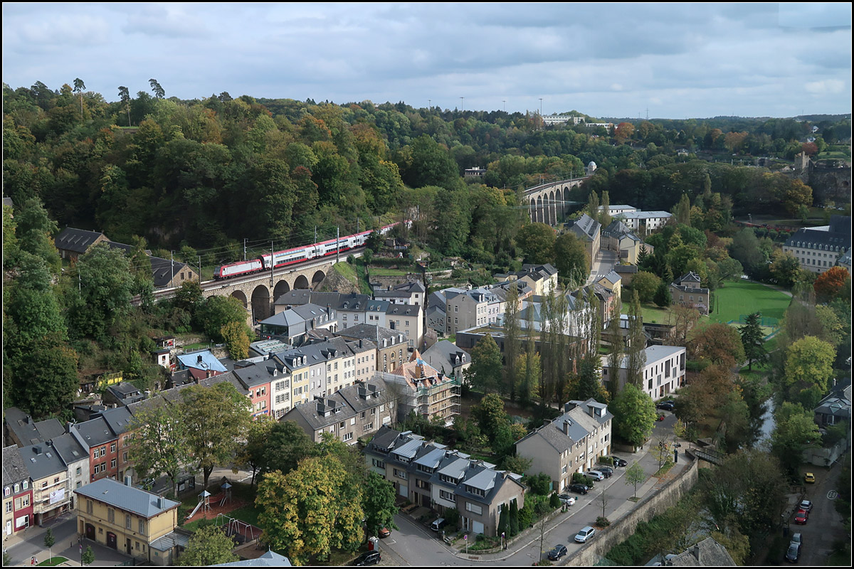 ... die Bergstation des Aufzuges Pfaffenthal - Oberstadt. Der RE von Luxemburg nach Troisvierges hat auf seiner Talfahrt inzwischen das Grünewald Viadukt erreicht.