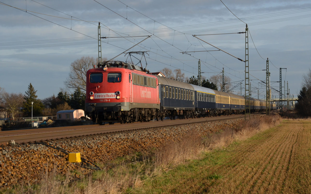 110 278 bespannte am 05.01.18 einen Sonderzug für den Eishockeyclub Eisbären Berlin. Diese waren mit dem Sonderzug zum Auswärtsspiel nach München unterwegs. Hier rollt der Centralbahn-Sonderzug durch Gräfenhainichen Richtung Bitterfeld.