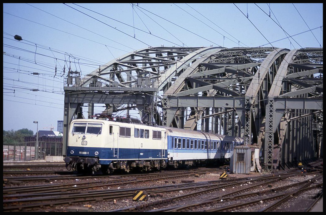 111088 verlässt hier am 21.5.1992 um 15.08 Uhr mit einem Interregio die Hohenzollernbrücke in Köln und fährt in den Hauptbahnhof ein.