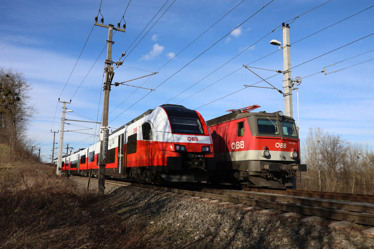 1144.023 wartet am Samstag dem 6.01.2018 in Spielfeld Strass auf weitere Arbeit während sich ein weiterer Cityjet auf den Weg Richtung Graz macht.