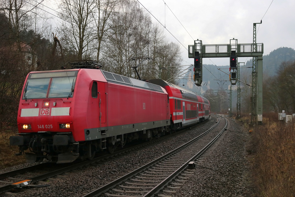 146 025 der S-Bahn Dresden (DB Regio Südost) als S 31737 (S1) von Meißen Triebischtal nach Schöna erreicht den Bahnhof Kurort Rathen auf der Bahnstrecke Děčín–Dresden-Neustadt (KBS 241.1 | Elbtalstrecke). [16.12.2017 | 14:06 Uhr]
