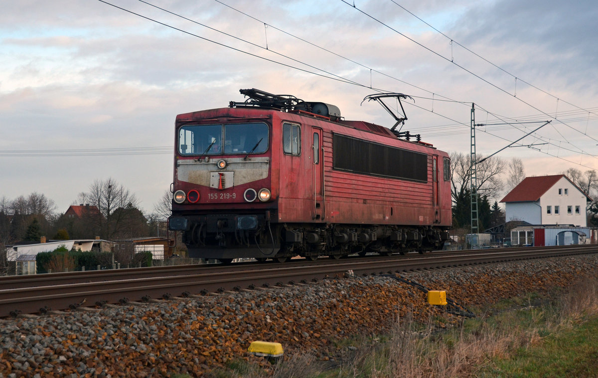 155 219 war am 05.01.18 Lz unterwegs. Hier rollt der Kabelcontainer durch Gräfenhainichen Richtung Bitterfeld.