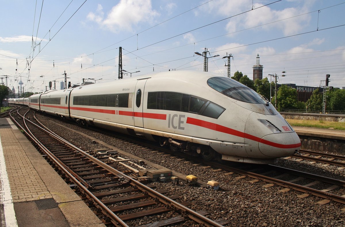 403 504-4 "München" und 403 028-4 "Aachen" passieren am 2.7.2017 als ICE201 von Köln Hauptbahnhof nach Basel SBB den Bahnhof Köln Messe/Deutz in Richtung Osten.