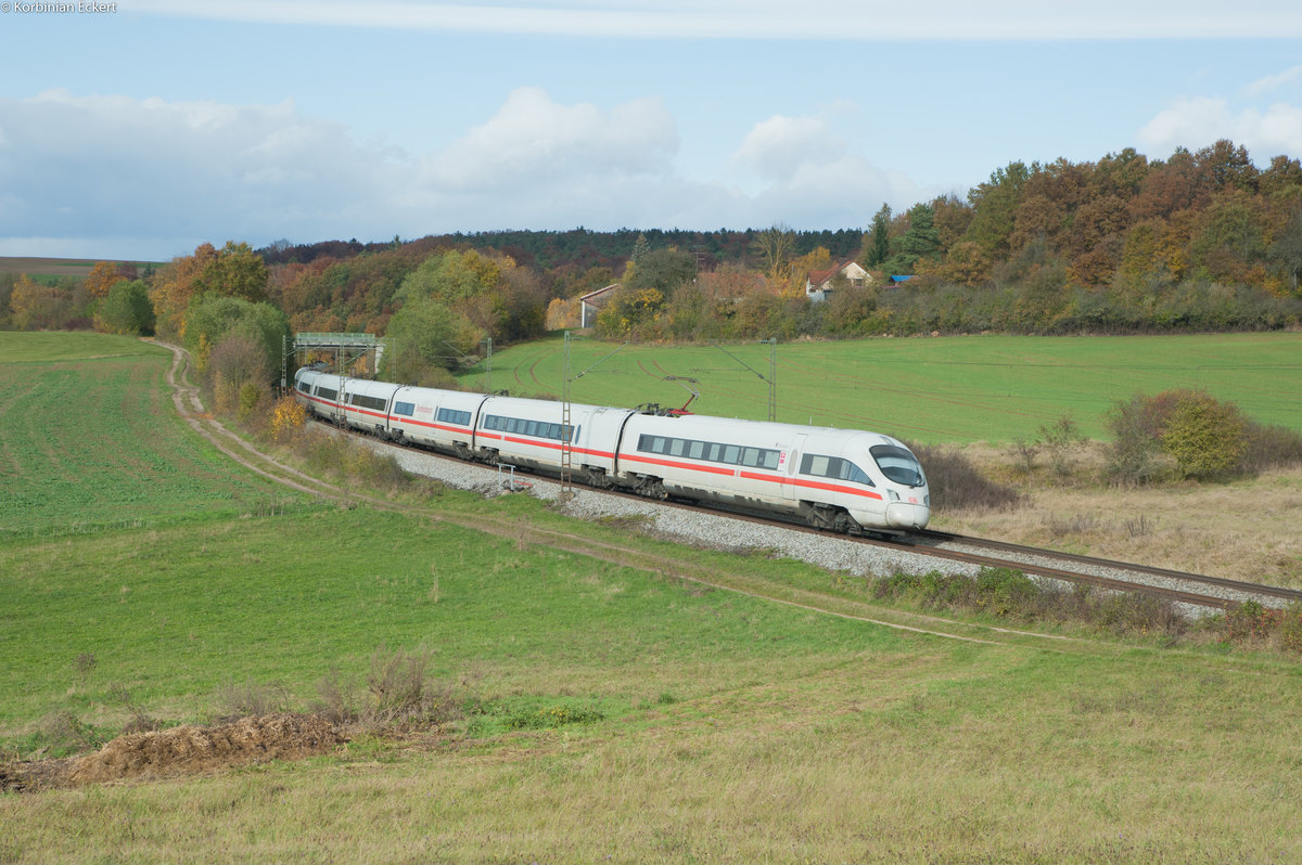411 068 (Ellwangen) mit dem ICE 91 von Hamburg Altona nach Wien bei Edlhausen, 02.11.2016