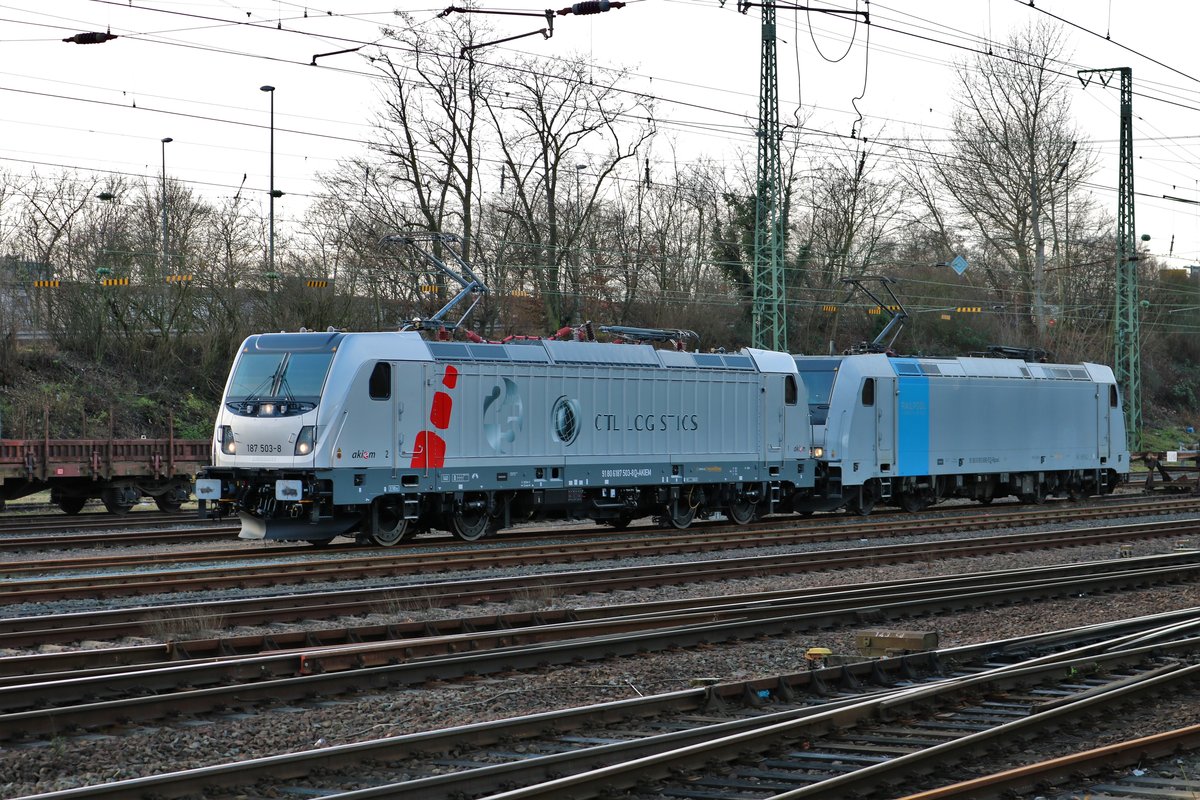 Akiem/CTL Logistics Bombardier Traxx 187 503-8 am 07.01.18 in Hanau Hbf Süd vom einen Gehweg aus fotografiert
