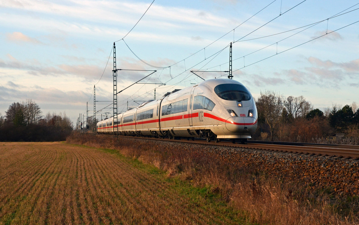 Der als ICE 1005 fahrende ICE-Sprinter von Berlin nach Frankfurt(M) rollte am 01.01.18 durch Burgkemnitz Richtung Bitterfeld.