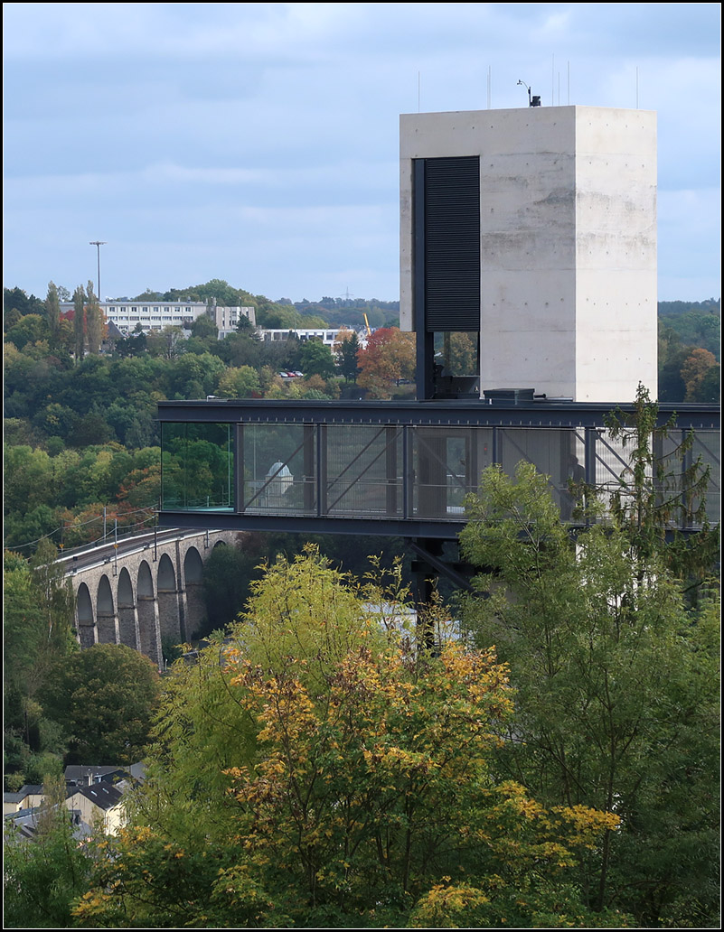 ... der im Juli 2016 eröffnete 60 Meter hohe Aufzug Pfaffenthal - Oberstadt in Luxemburg. Im Bild die gläserne Bergstation, von der man einen schönen Blick in Tal und zu den Grünewald und Paffenthal Viadukte. Hier im Hintergrund das Pfaffenthal Viadukt.