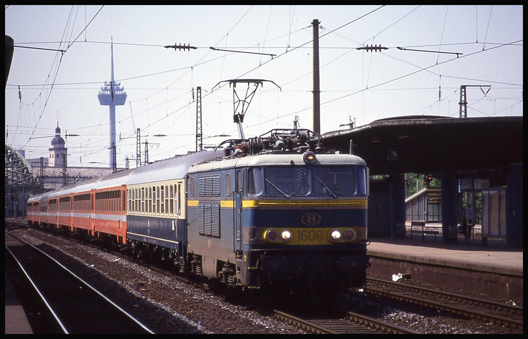 Die SNCB Elektrolok 1606 fährt hier am 21.5.1992 um 14.45 Uhr mit ihrem Schnellzug aus Oostende in Köln Messe Deutz ein.