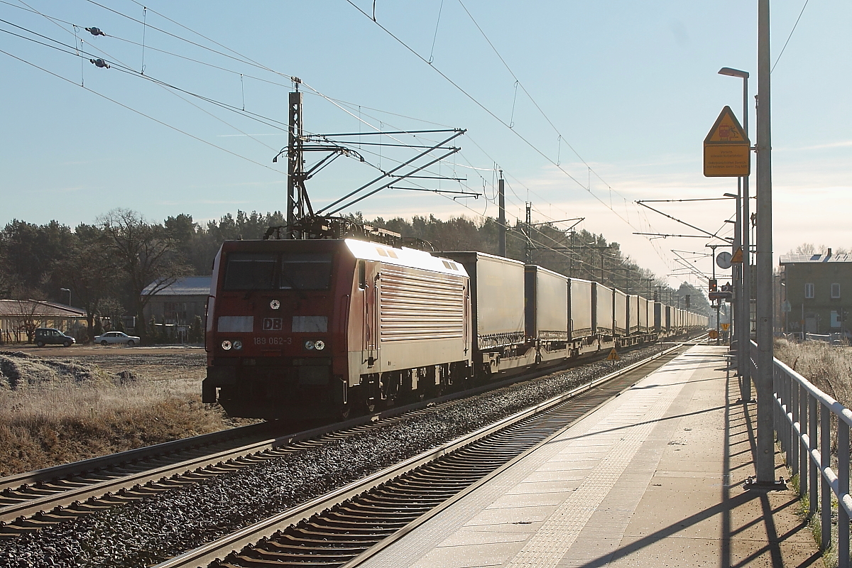 Die 189 062-3 mit einem KLV Zug am 08.01.2018 in Nassenheide.