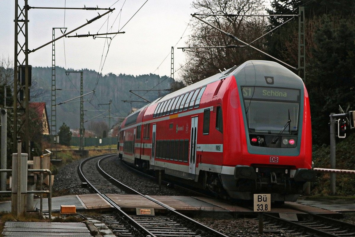 Nachschuss auf 143 884 der S-Bahn Dresden (DB Regio Südost) als S 31740 (S1) von Schöna nach Meißen Triebischtal, die den Bahnhof Kurort Rathen auf der Bahnstrecke Děčín–Dresden-Neustadt (KBS 241.1 | Elbtalstrecke) verlässt. [16.12.2017 | 13:56 Uhr]