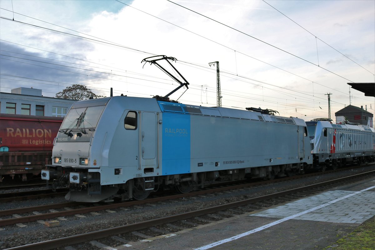 Akiem/CTL Logistics Bombardier Traxx 187 503-8 und Railpool Bombardier Traxx 185 690-5 am 07.01.18 in Hanau Hbf Süd vom einen Gehweg aus fotografiert