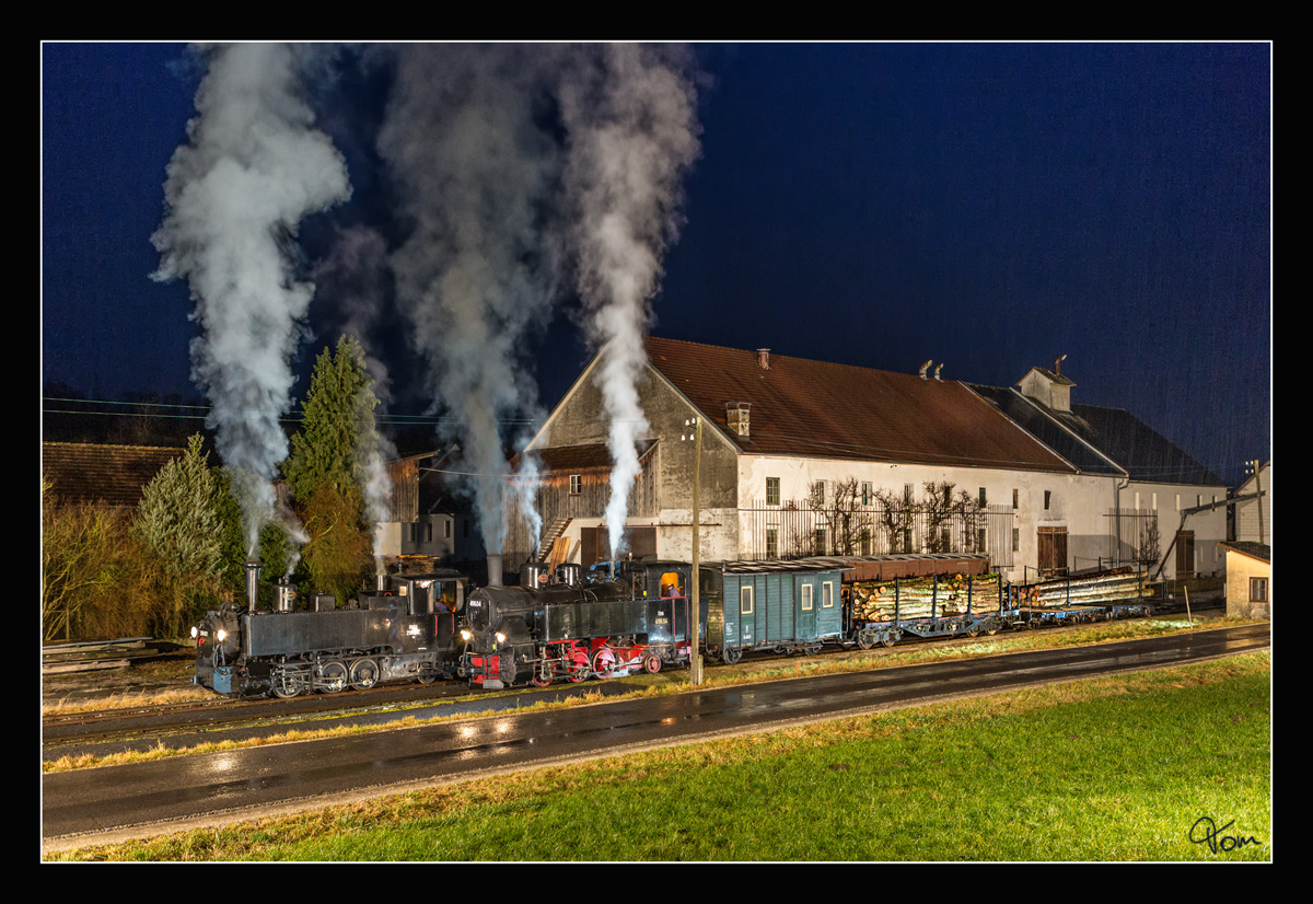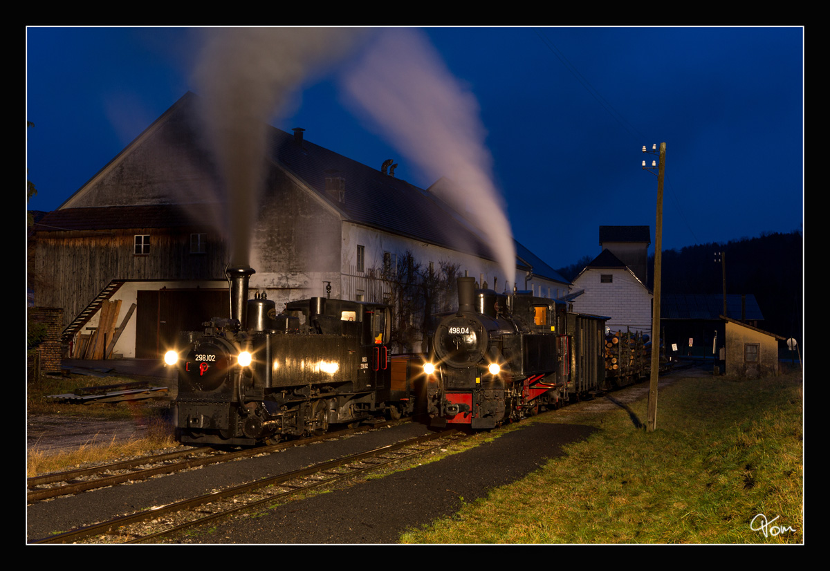 Through the dark night II - Auf der Steyrtalbahn fuhren die beiden Dampfloks 498.04 und 298.102, hier zu sehen bei einem Halt in der Haltestelle Sommerhubermühle.