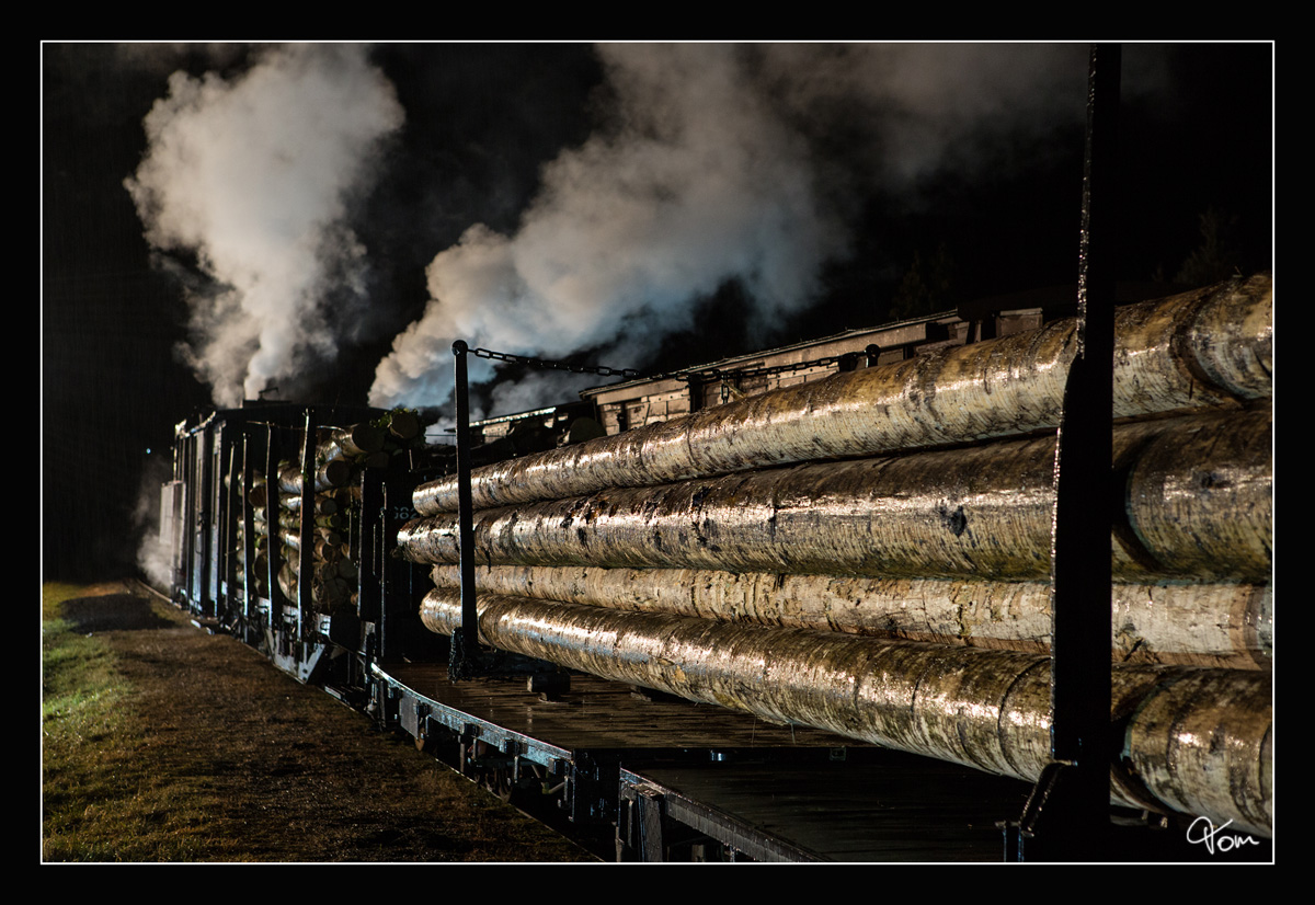 Through the dark night VI- Nachschuss auf die ÖGEG Dampflok 498.04, welche mit einem Holzzug aus der Haltestelle Sommerhubermühle dampft.