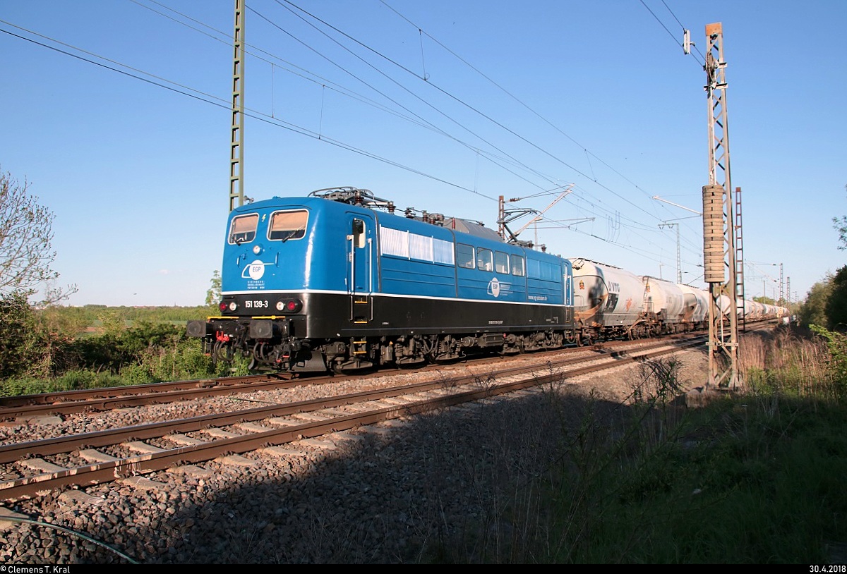 151 139-3 der Eisenbahngesellschaft Potsdam mbH (EGP) als Staubgutzug fährt in der Saaleaue bei Angersdorf auf der Bahnstrecke Halle–Hann. Münden (KBS 590) Richtung Angersdorf. [30.4.2018 | 18:53 Uhr]