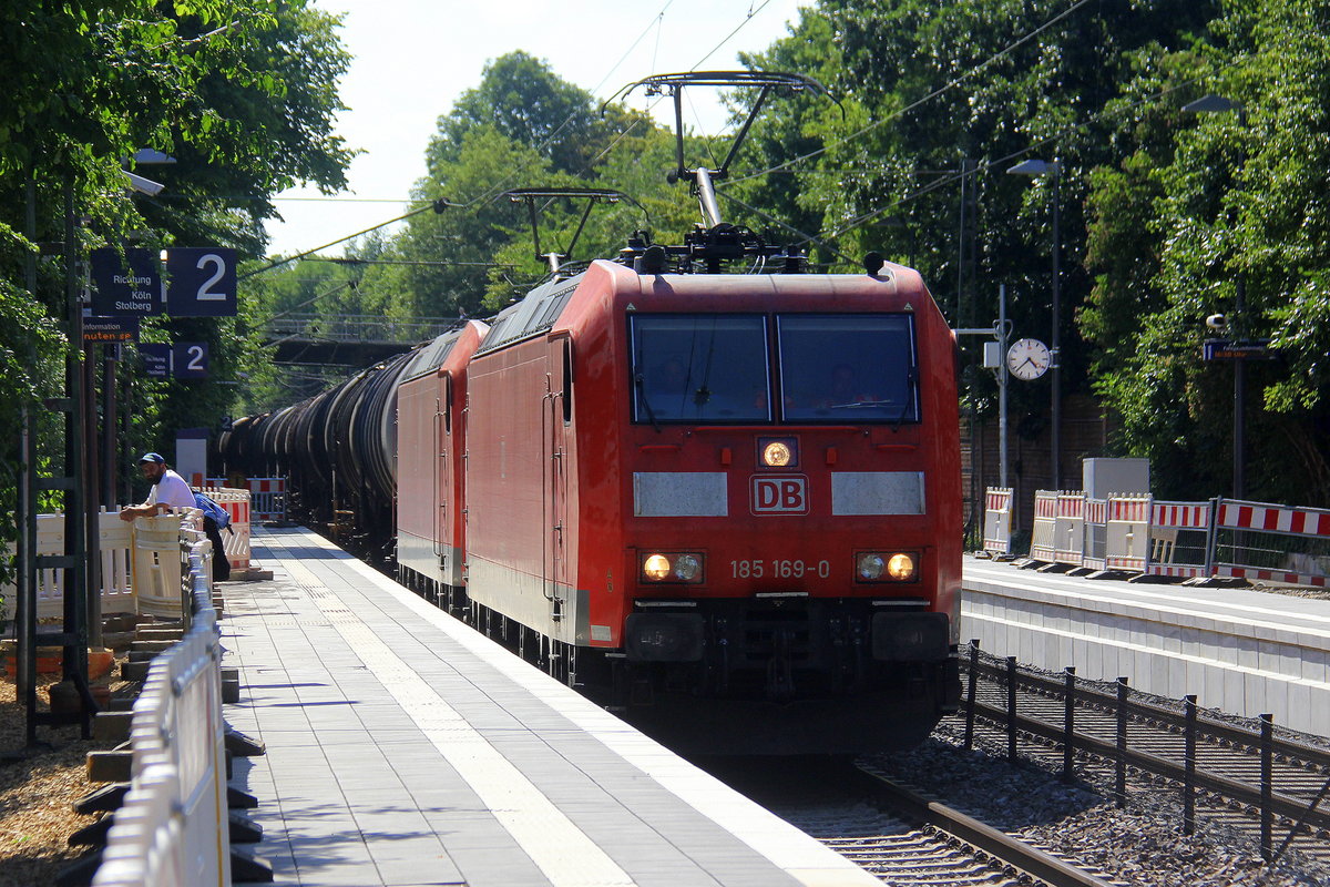 185 169-0 und 185 197-1 beide von DB kommen mit einem Ölzug aus Antwerpen-Petrol(B) nach Basel(CH) und kammen aus Richtung Aachen-West,Aachen-Schanz,Aachen-Hbf,Aachen-Rothe-Erde und fahren durch Aachen-Eilendorf in Richtung Stolberg-Hbf(Rheinland)Eschweiler-Hbf,Langerwehe,Düren,Merzenich,Buir,Horrem,Kerpen-Köln-Ehrenfeld,Köln-West,Köln-Süd. Aufgenommen vom Bahnsteig 2 in Aachen-Eilendorf.