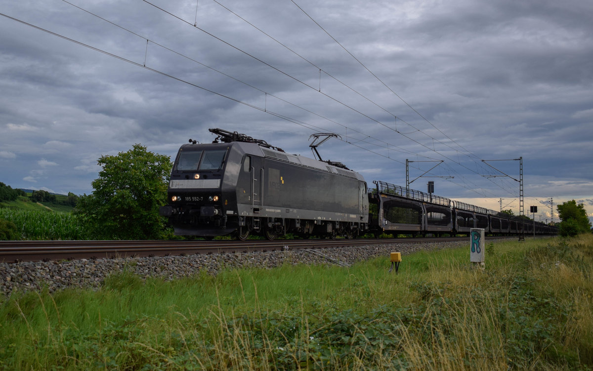 185 552 am 05.07.2018 mit dem Autozug von Mulhouse Nord nach Trnava, kurz vor dem Hp Buggingen.