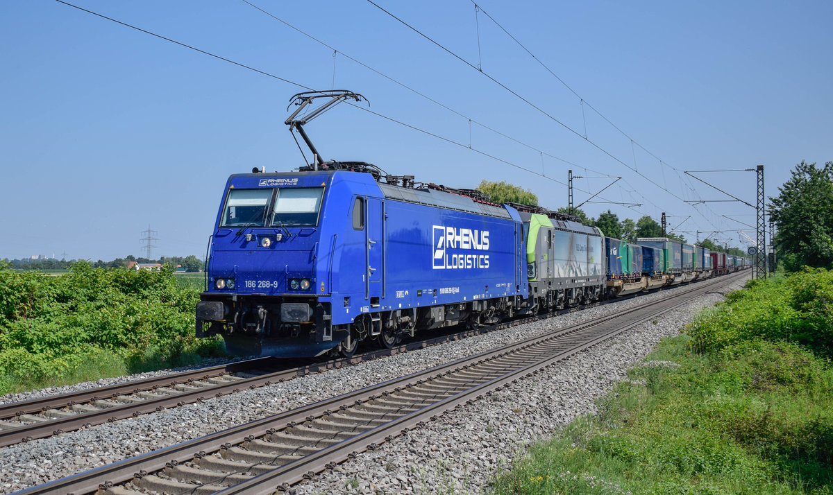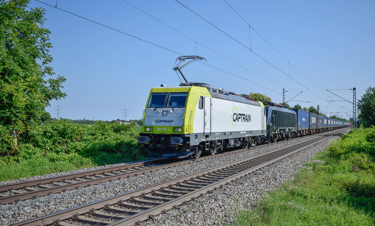 186 152 war es, die am 01.07.2018 als erste Captrain-186 nach Basel kam. Mit dem Durchfahren von Buggingen hat sie Basel fast erreicht. Die kalte Lok ist 189 997.