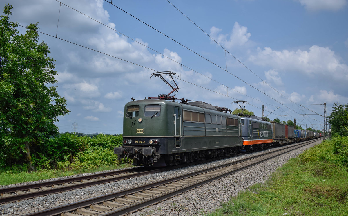 Am 09.06.2018 gab es ein Highlight zu bestaunen, die angemietete 151 124 + 162 xxx mit einem KLV durch Buggingen nach Basel.