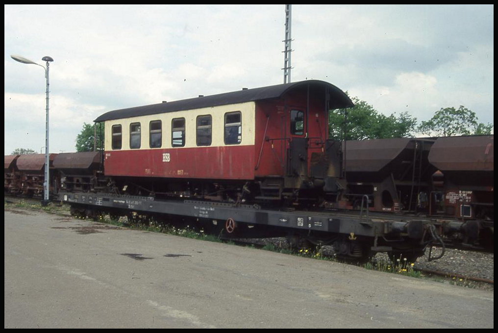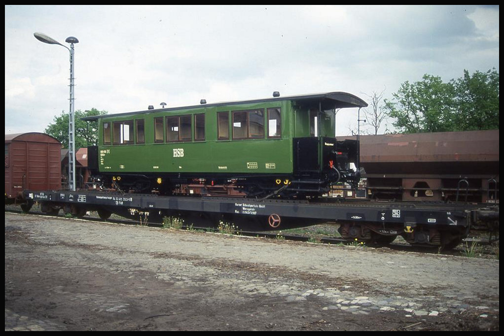 Am westlichen Ortseingang Wernigerode stand am 12.5.1994 dieser Personenwagen des Traditionszuges der HSB auf einem Flachwagen der DR.