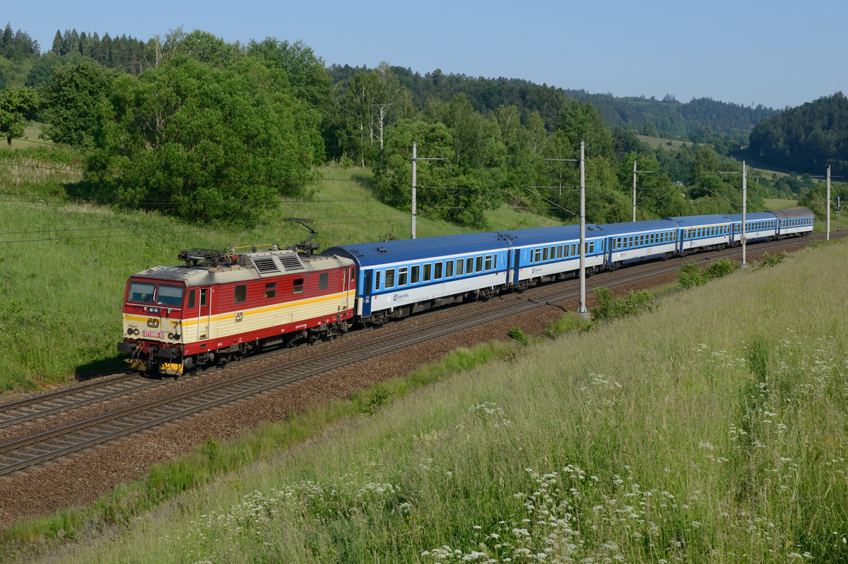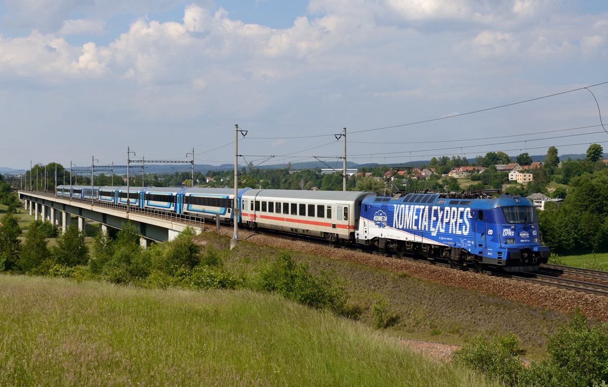 Dem tschechischen Eishockeyclub "HC Kometa Brno" zu Ehren wurde die 380 017 in den Vereinsfarben beklebt, und von mir bei der Überquerung des Talübergangs zwischen Dlouhá Třebová und Česká Třebová vor dem EC 281 "Jan Jesenius" (Praha hl.n. nach Budapest-Keleti pu.) fotografiert.