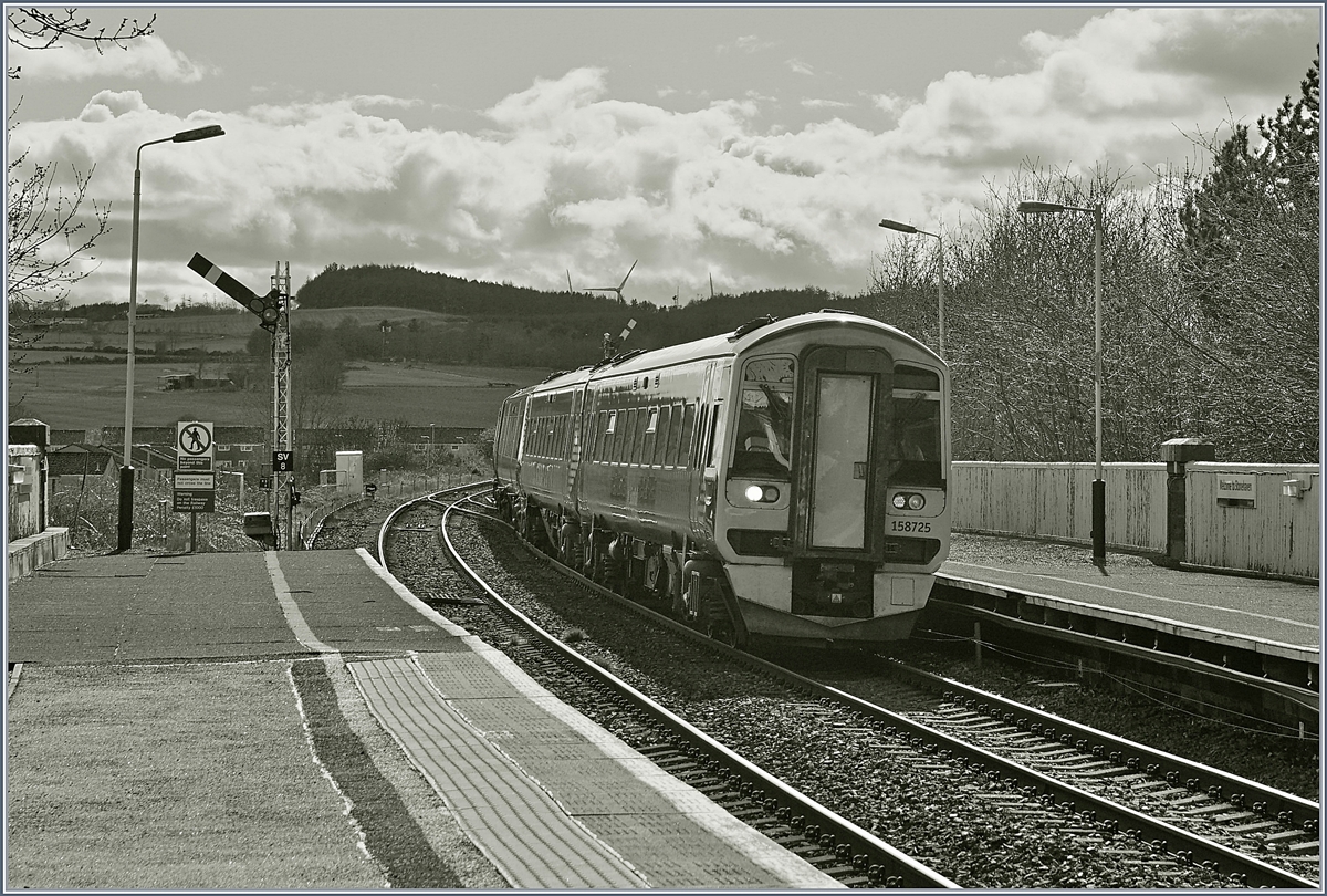 Der Scotrail Class 158 mit der Nummer 158725 erreicht als Glasgow - Aberdeen Service den Bahnhof von Stonehavn.