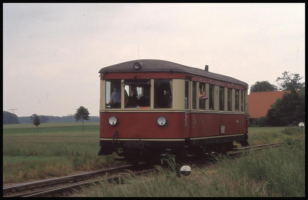 DEV Triebwagen T 42 fährt hier am 19.6.1994 in Bruchhausen Vilsen ein.