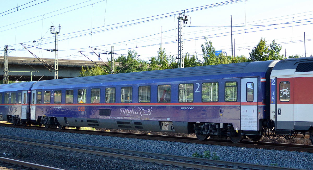 Ein morgendlicher Nachtzug aus Insbruck der NJ 40420 mit einem seat car (Sitzwagen) des nightjet mit der Nr. A-ÖBB 73 81 21-91 119-7 Bmz am 30.06.18 Bf. Einfahrt Bf. Hamburg-Harburg.