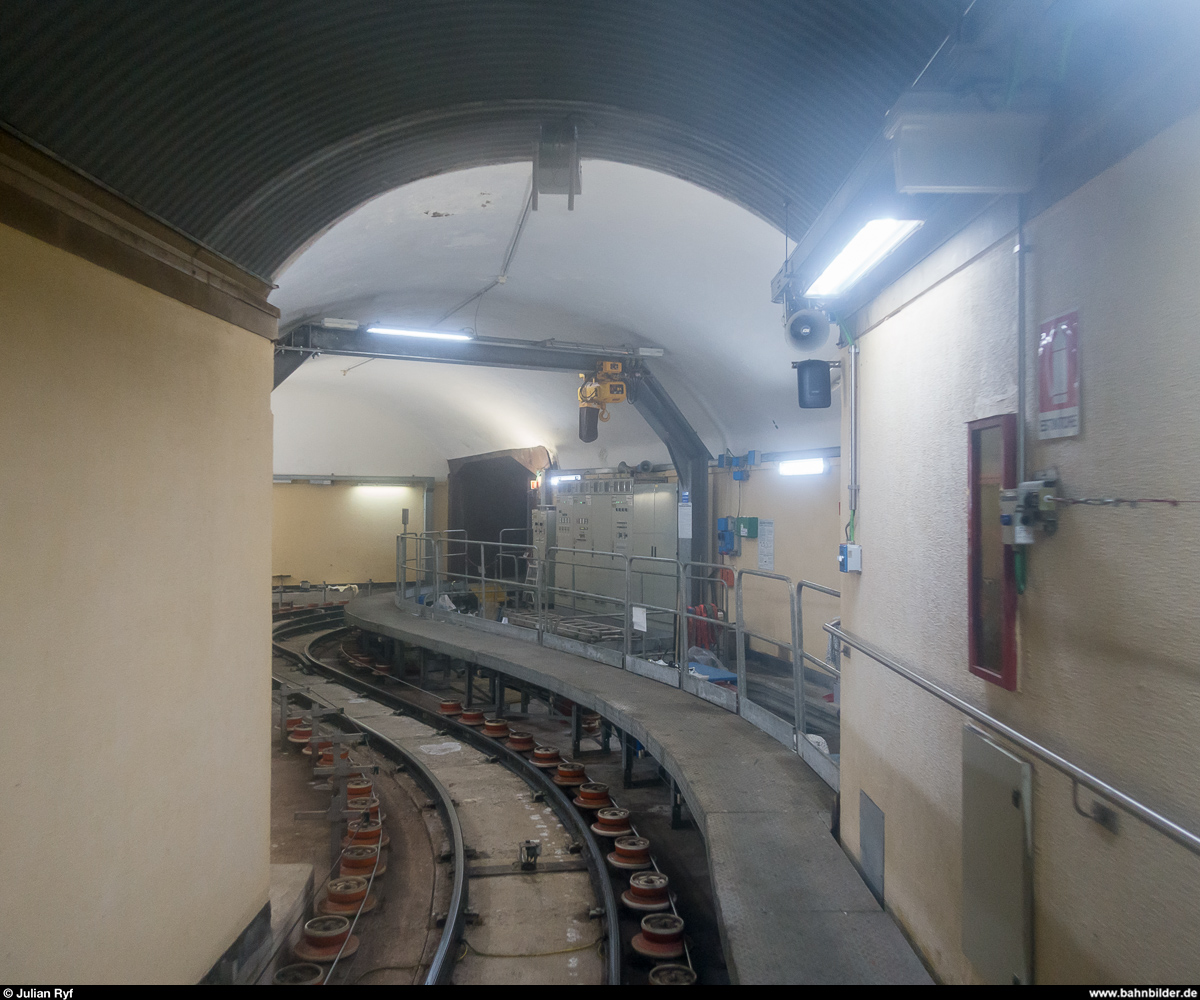 In Genova finden sich einige interessante Verkehrsmittel. Ein wahrscheinlich weltweit einzigartiges Unikum ist der Ascensore Castello d'Albertis-Montegalletto - ein Lift, welcher zuerst horizontal knapp 250 m in den Berg hineinfährt und danach vertikal knapp 70 m nach oben. Hier der Blick aus der Kabine am Ende des horizontalen Teils. Nach der S-Kurve geht es in den Liftschacht, wo auch die andere Kabine gekreuzt wird. Aufgenommen am 29. Juni 2018.