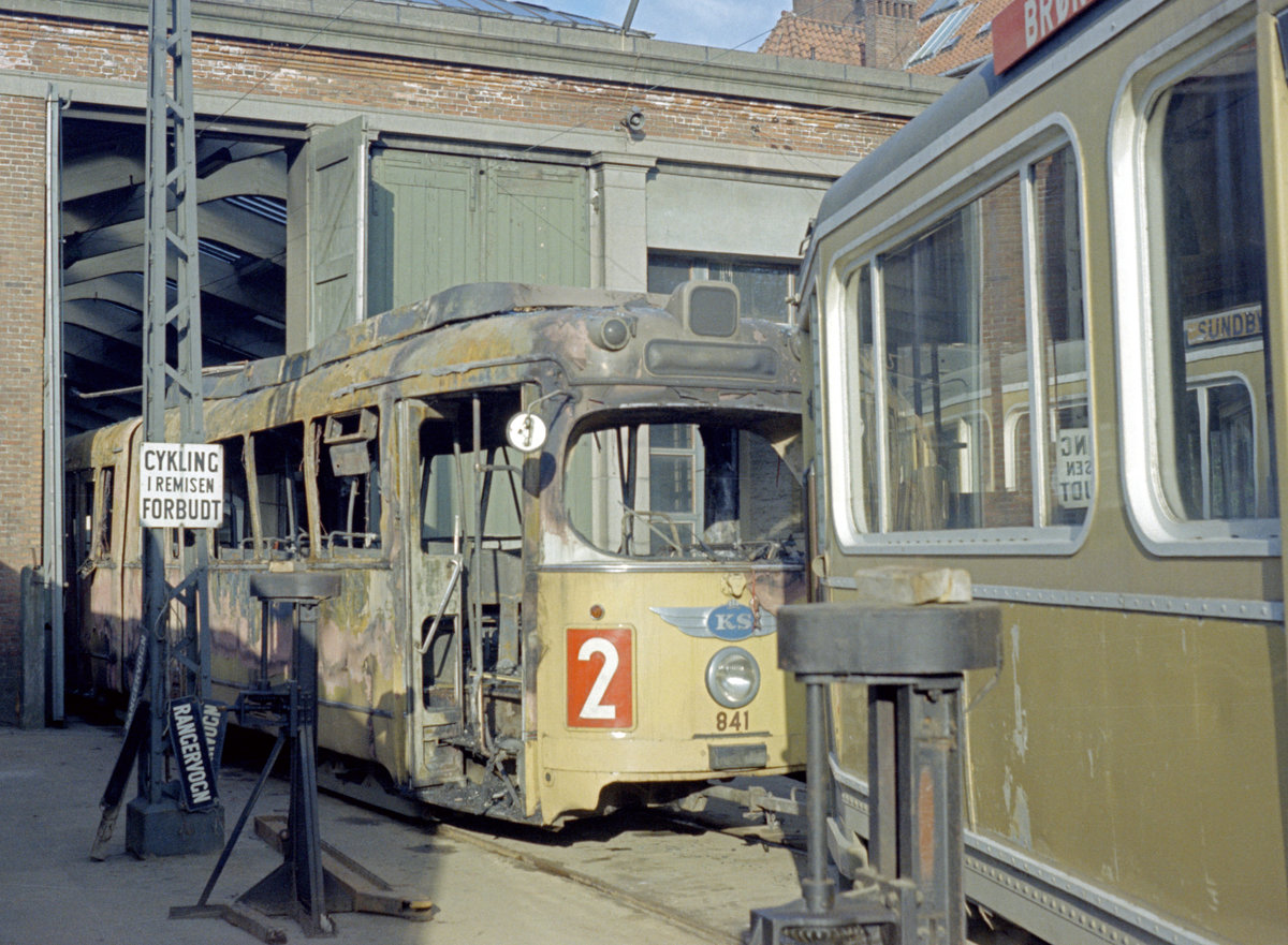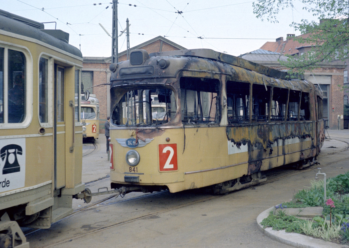 København / Kopenhagen Københavns Sporveje: Im Straßenbahnbetriebsbahnhof Sundby brannte der DÜWAG/Kiepe-GT6 841 am 22. Mai 1969 wegen Unvorsichtigkeit während Reparaturarbeiten völlig aus. -